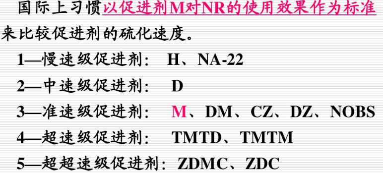 國際上習慣以促進劑M對天然橡膠的使用效果為標準來比較促進劑的硫化速度。