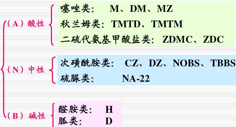 1.酸性促進劑:噻唑、秋蘭姆、二硫代氨基甲酸鹽、黃原酸鹽類